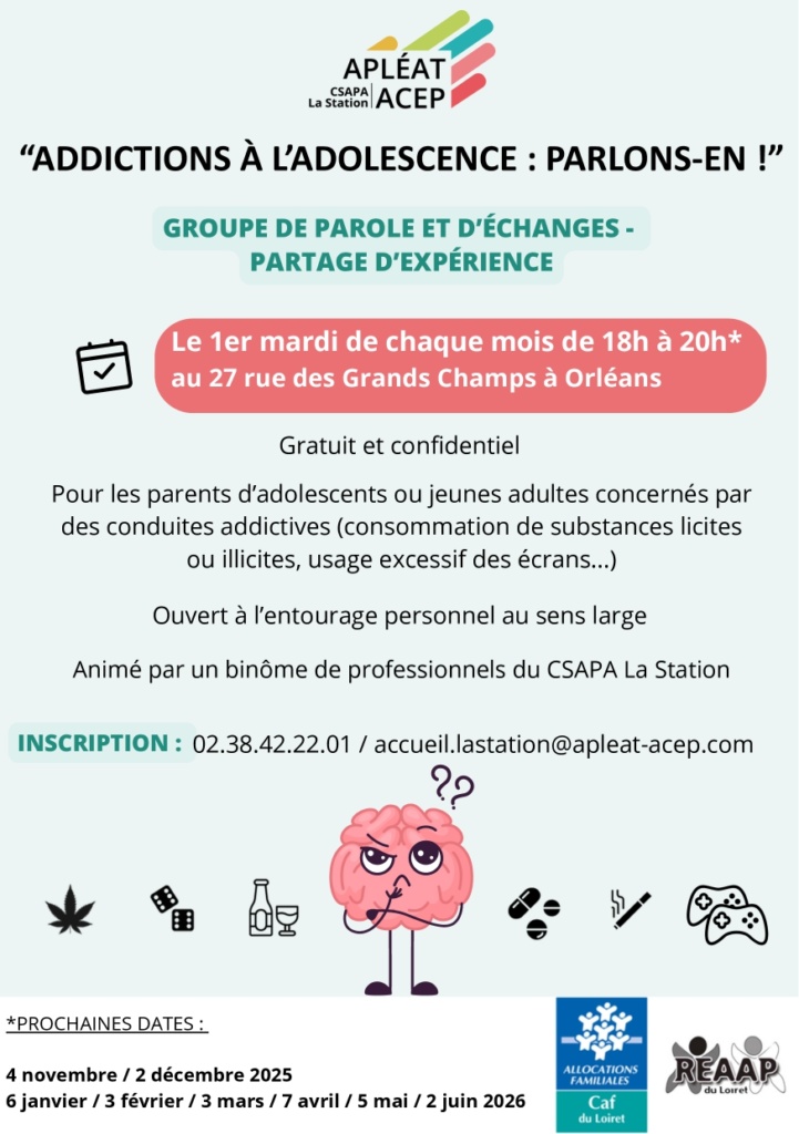 Le groupe de parole se tient tous les premiers mardis du mois de 18h à 20h. L’inscription se fait auprès de l’accueil du CSAPA La Station par téléphone au 02.38.42.22.01. L’ensemble des prochaines dates est disponible sur l’affiche.